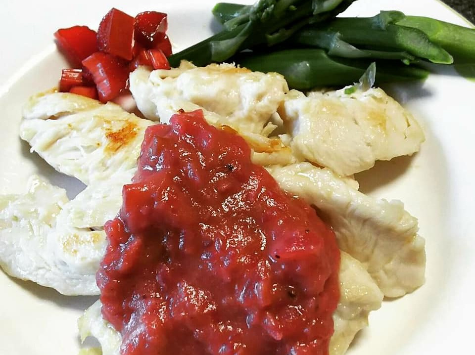 ⑤ルバーブに火が通り柔らかくなってきたら、砂糖、塩、こしょうを加える。